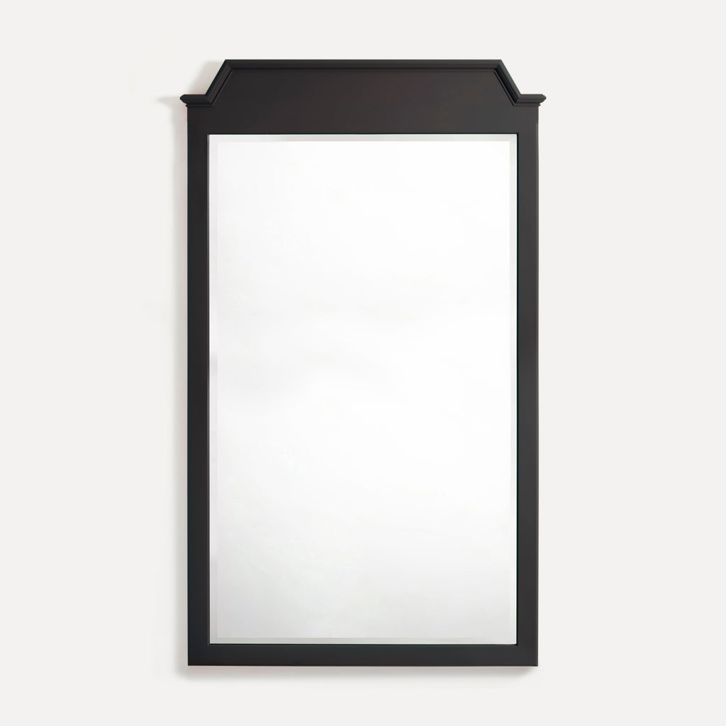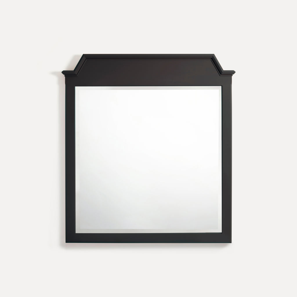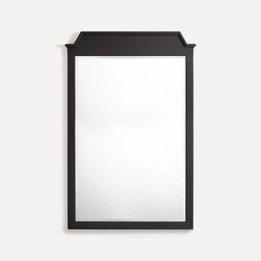 Materials and Finish: Solid hardwood frame with Belgian bevelled mirror glass. Hand-painted in intensely pigmented, low VOC, water-based paint with a low sheen. Backs left open to allow fitting of a heated mirror pad for use in a bathroom.