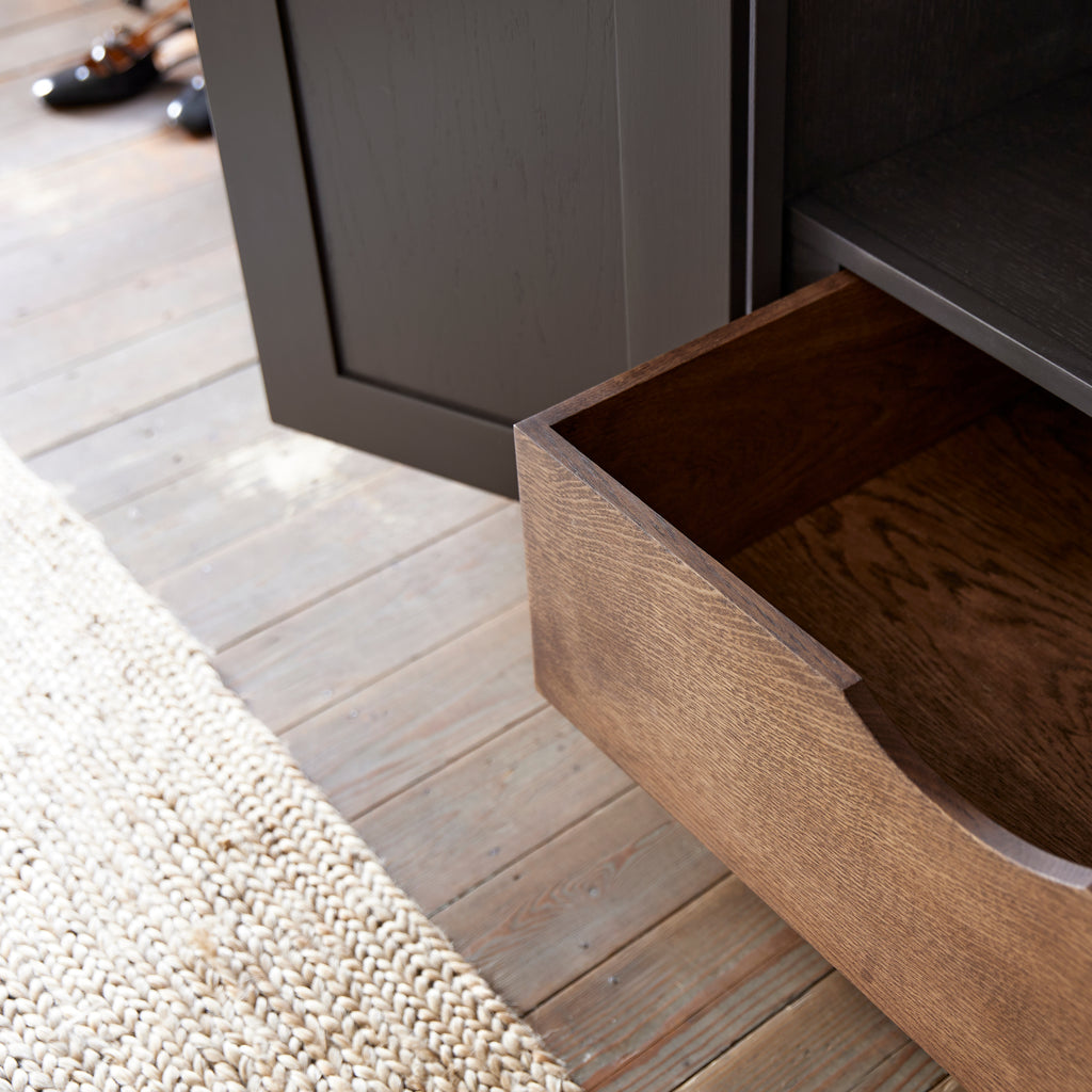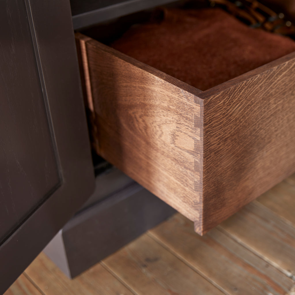 Details vary across the collection, but may include the following. Drawer boxes are dovetailed oak on soft-close runners. Knobs are cast bronzed-brass, developing a patina over time. Doors are hung on traditional brass butt hinges and frames are solid hardwood.