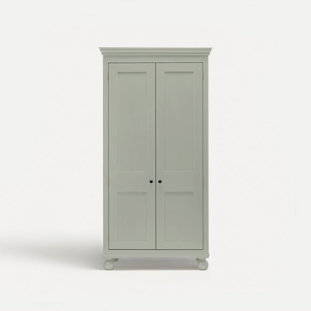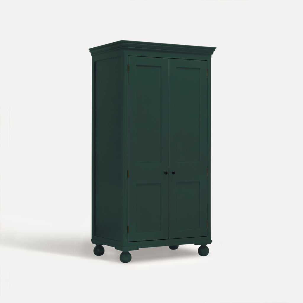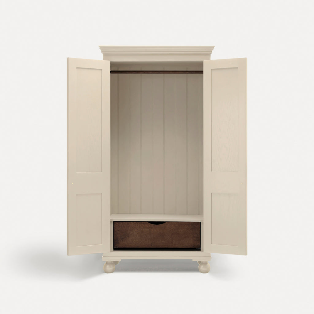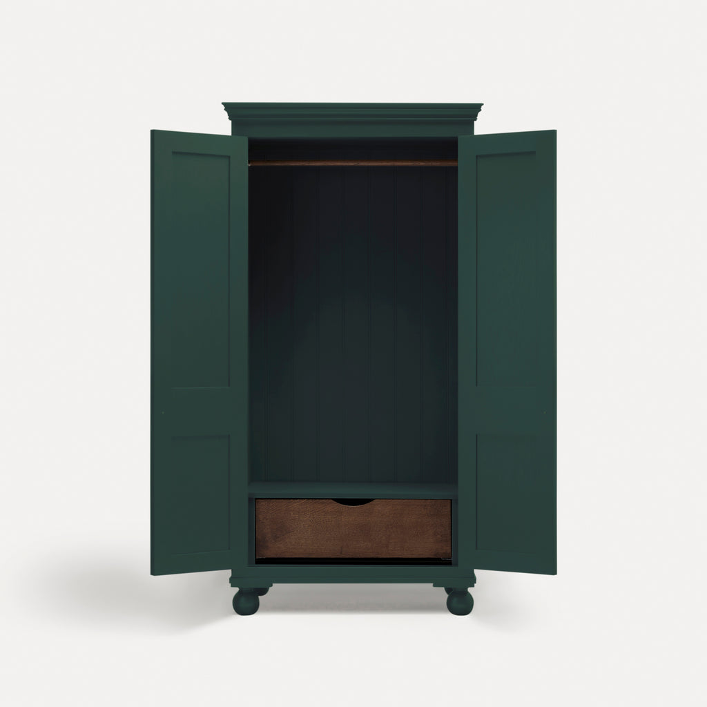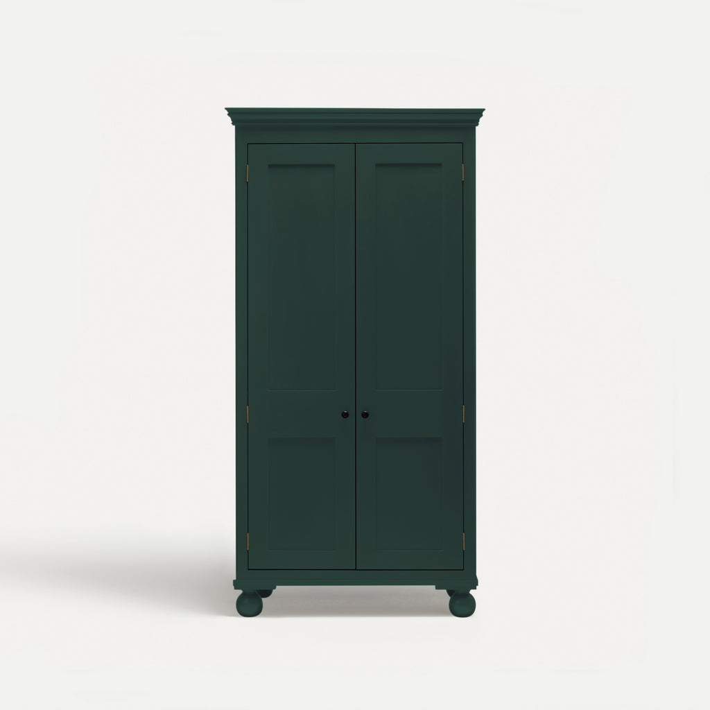 Materials and Finish: Solid hardwood frame and oak faced panels, dovetailed oak drawer box on soft-close runners, oak hanging rail, hand-turned feet and tongue and groove interior back detail. Hand-painted inside and out in intensely pigmented, low VOC, water-based paint with a low sheen. Doors hung on solid drawn brass hinges. Knobs are cast bronzed brass.