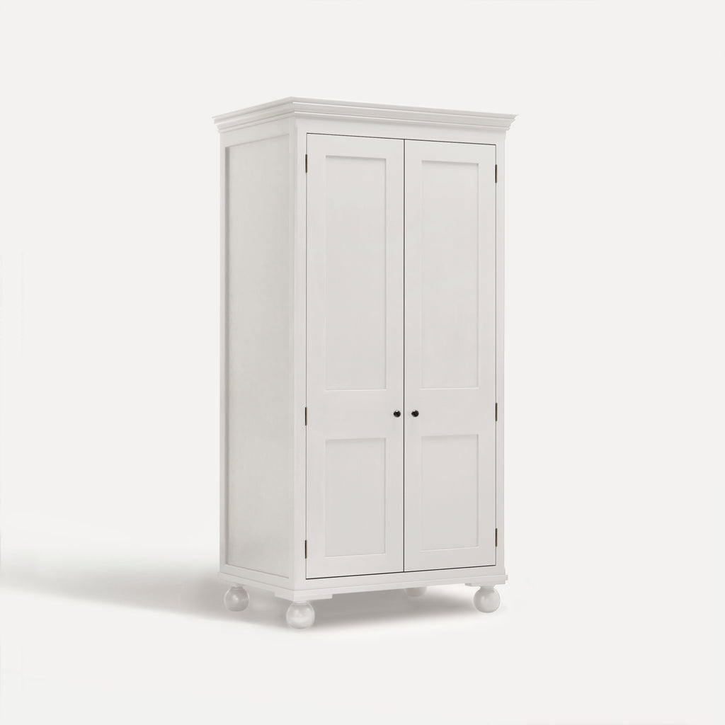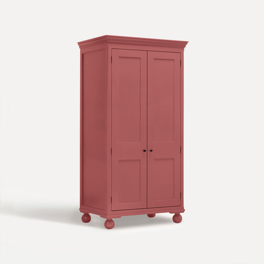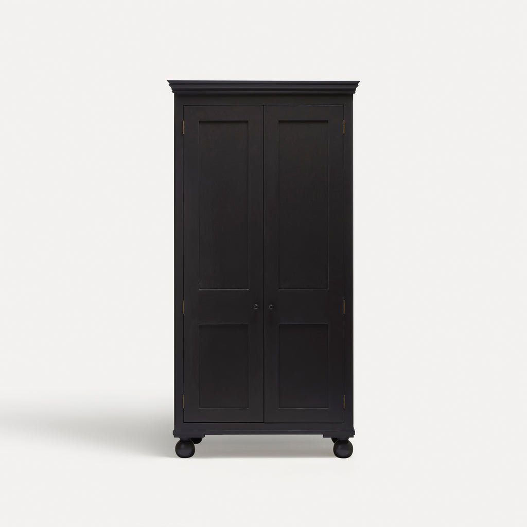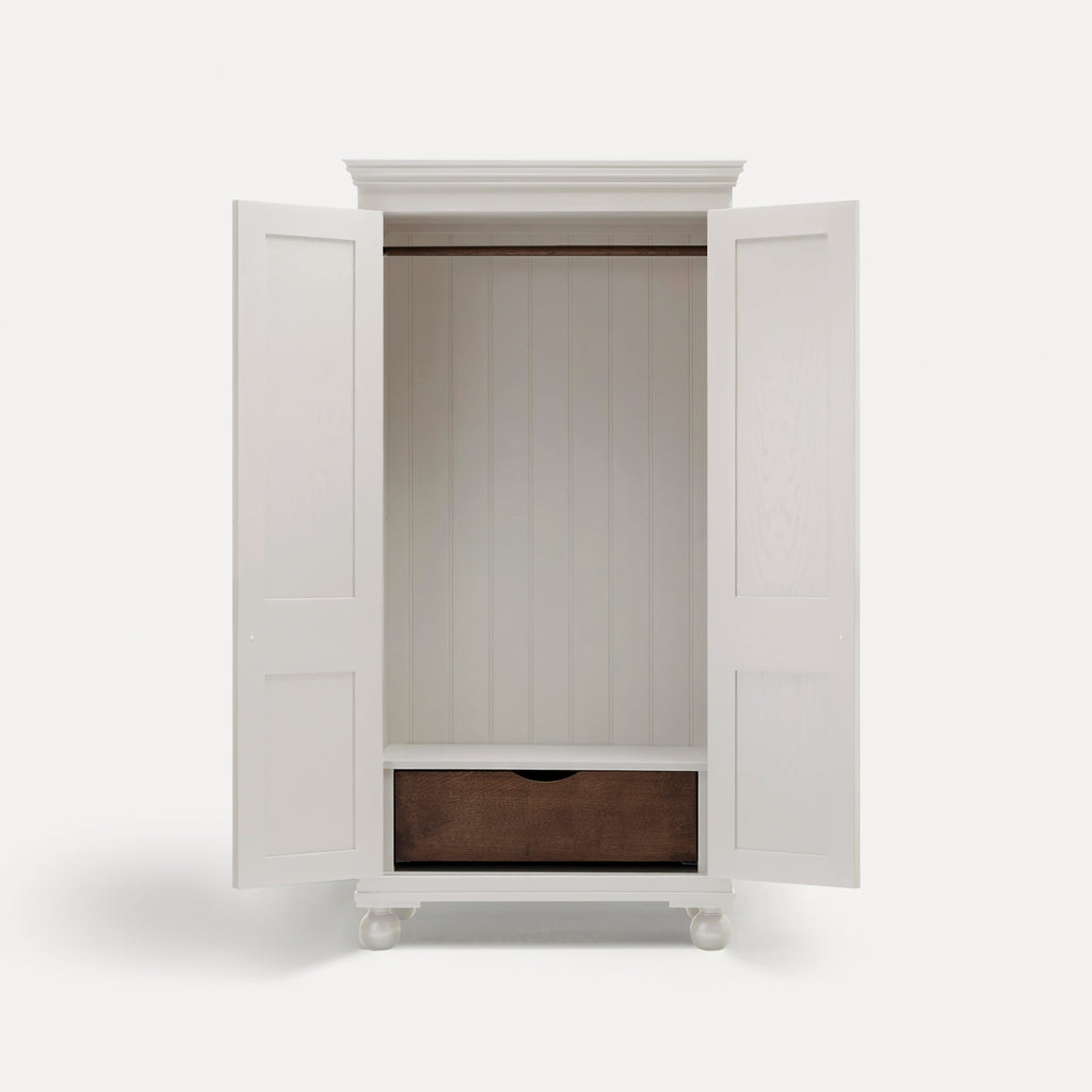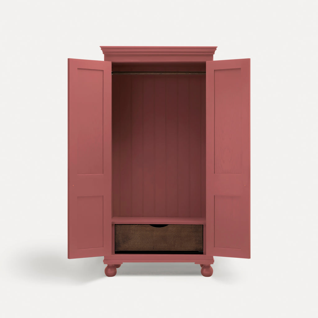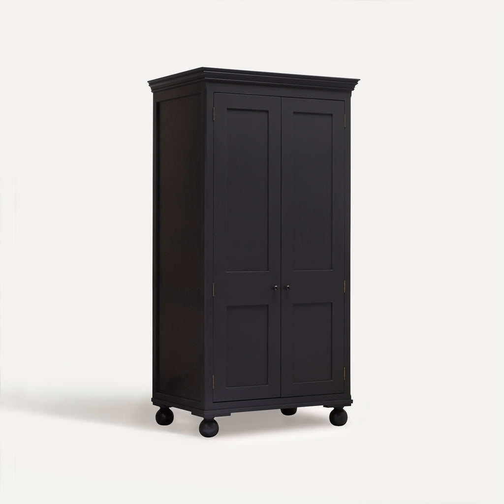 Materials and Finish: Solid hardwood frame and oak faced panels, dovetailed oak drawer box on soft-close runners, oak hanging rail, hand-turned feet and tongue and groove interior back detail. Hand-painted inside and out in intensely pigmented, low VOC, water-based paint with a low sheen. Doors hung on solid drawn brass hinges. Knobs are cast bronzed brass.