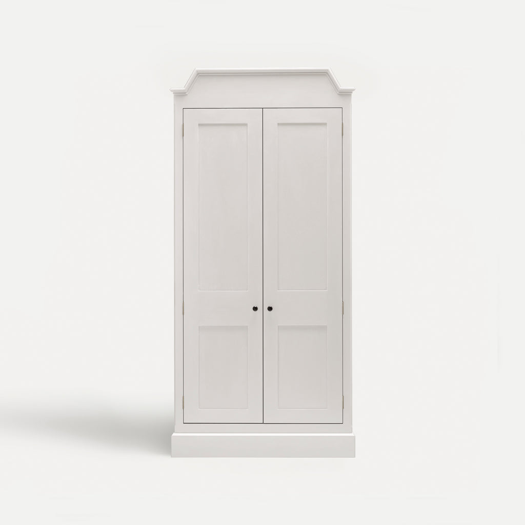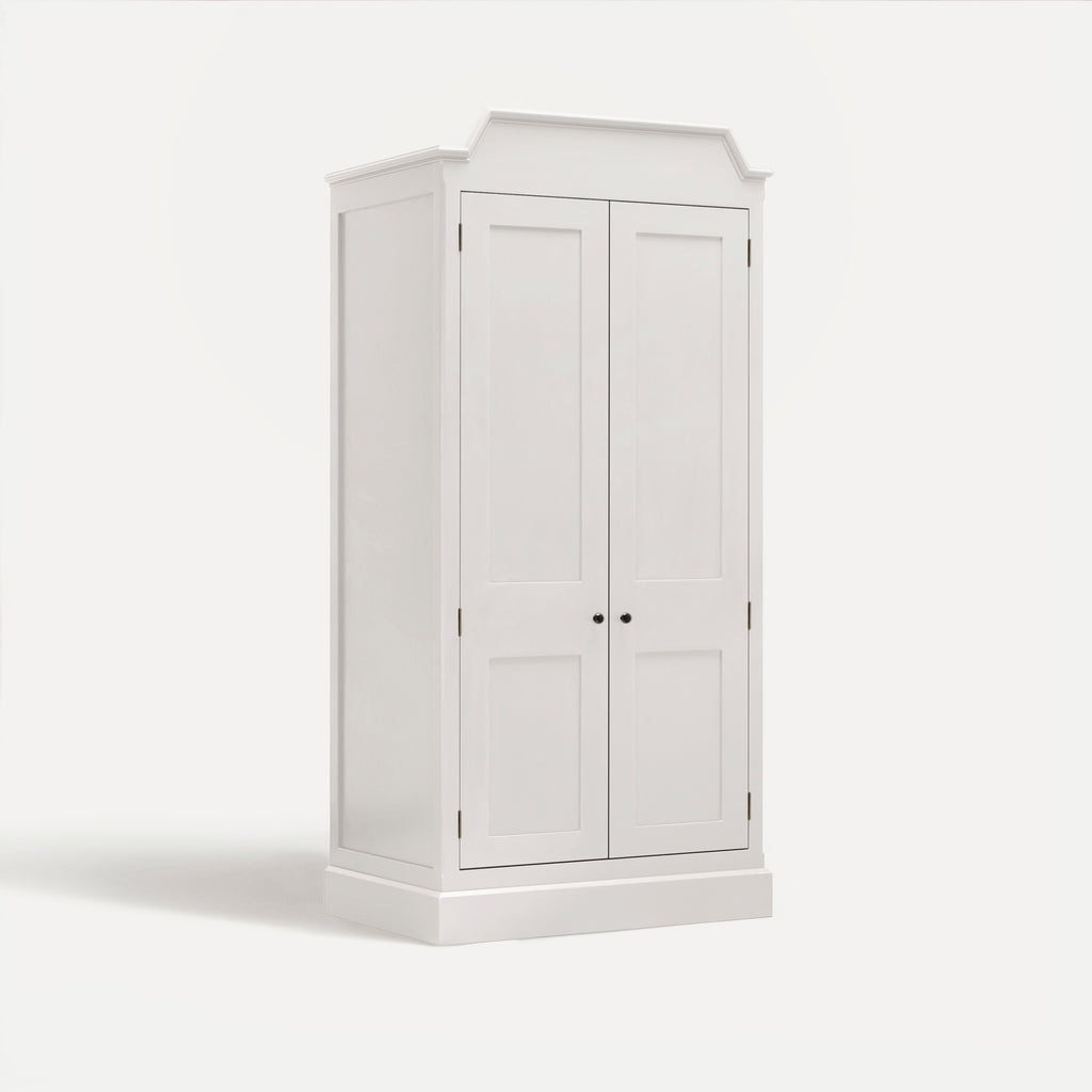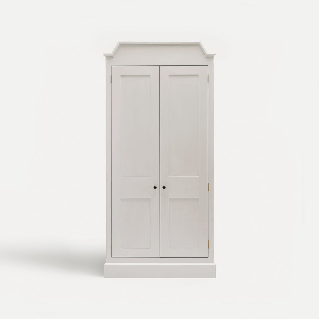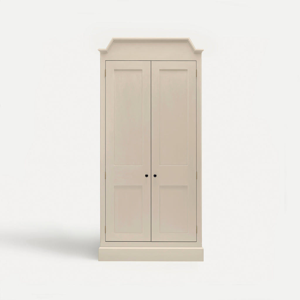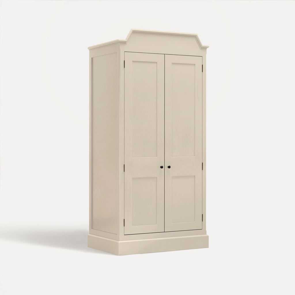 Interior backs feature traditional tongue-and-groove detail, and shelves are adjustable on birds-beak supports. Mirrors are fitted with Belgian glass, generously bevelled to reflect light beautifully, bringing depth to a room.