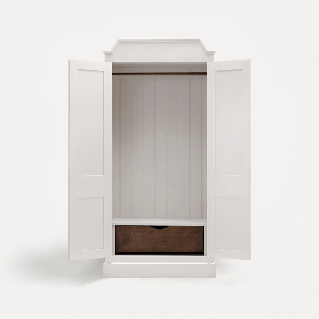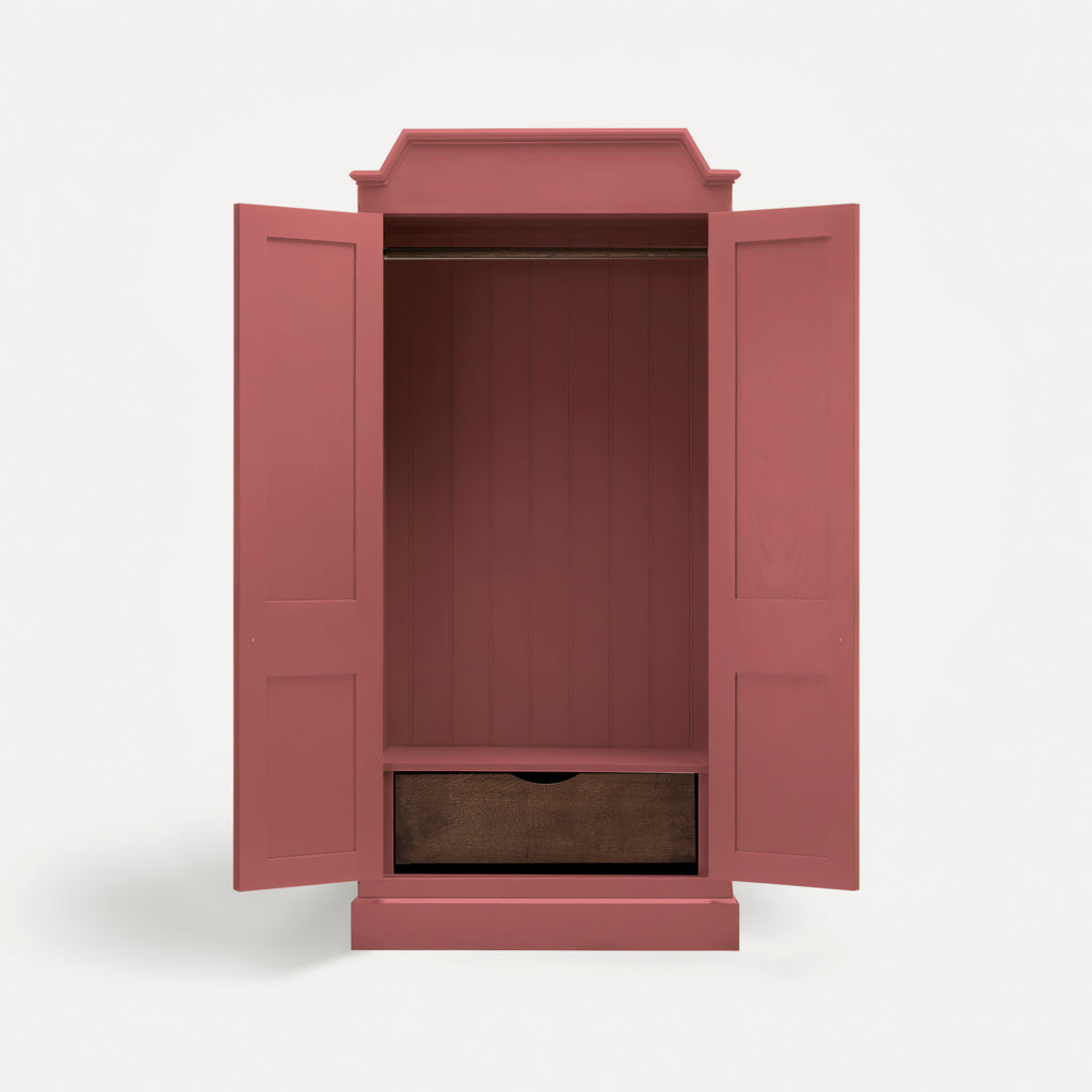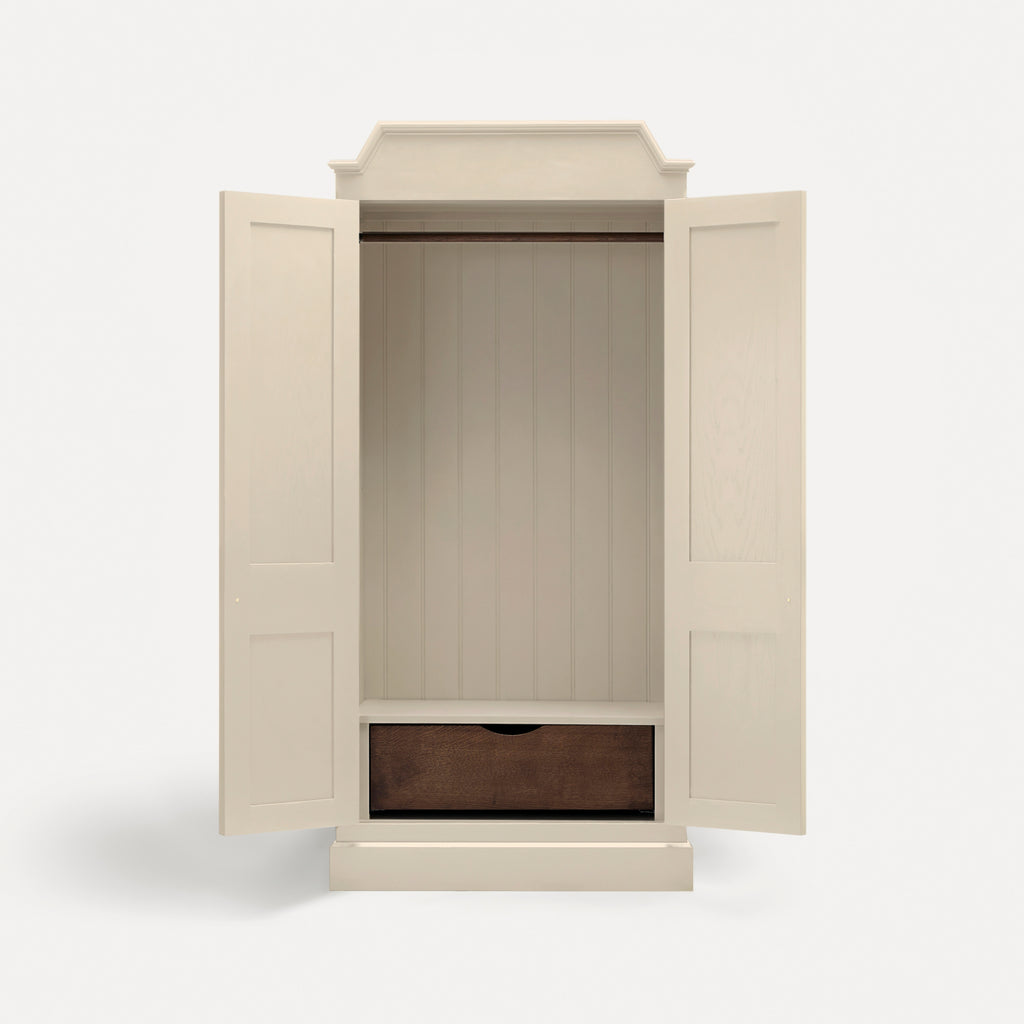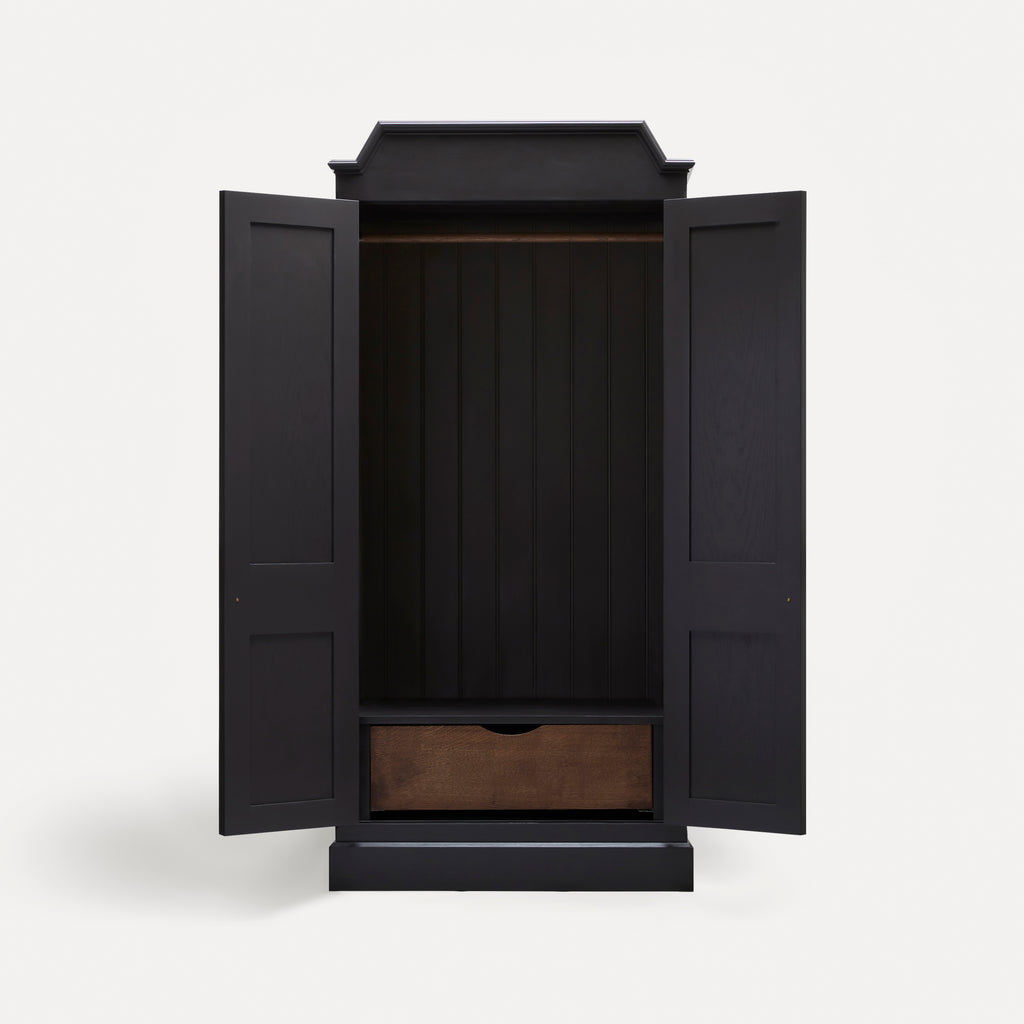 Details vary across the collection, but may include the following. Drawer boxes are dovetailed oak on soft-close runners. Knobs are cast bronzed-brass, developing a patina over time. Doors are hung on traditional brass butt hinges and frames are solid hardwood.